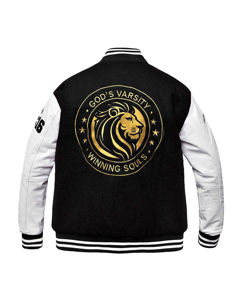 Made of the finest wool blend and leather sleeves, each jacket showcases the chenille logo on the front left chest, and the embroidered God’s Varsity “winning souls” logo on the back. The leather sleeves are embroidered with the Bible verse: John 3:16 on the left sleeve, and a stylish cross with the words: Faith Hope Love on the right sleeve. The right chest leaves room for you to customize your jacket by having your name embroidered if you so desire. The lining is 100 grams polyester.