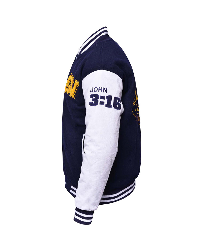 Made of the finest wool blend and leather sleeves, each jacket showcases the chenille logo on the front left chest, and the embroidered God’s Varsity “winning souls” logo on the back. The leather sleeves are embroidered with the Bible verse: John 3:16 on the left sleeve, and a stylish cross with the words: Faith Hope Love on the right sleeve. The right chest leaves room for you to customize your jacket by having your name embroidered if you so desire. The lining is 100 grams polyester.